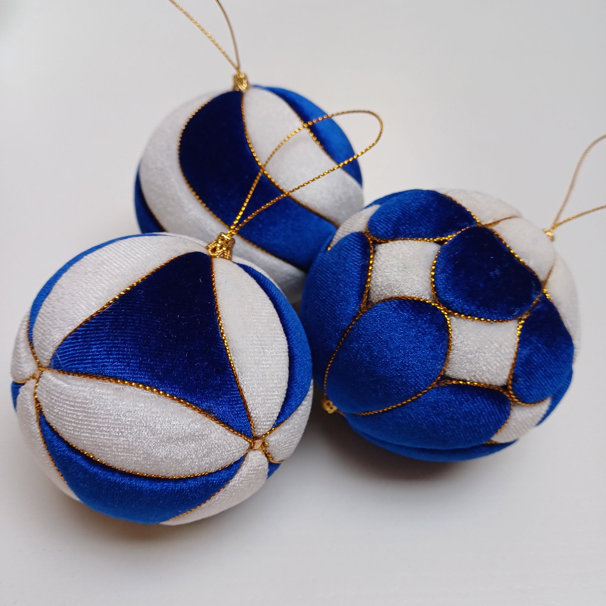 Collezione di palline natalizie in base di polistirolo di diametro 8 cm. La collezione è realizzata nei colori blu royale e bordeux. Fatta in tecnica Kimekomi.