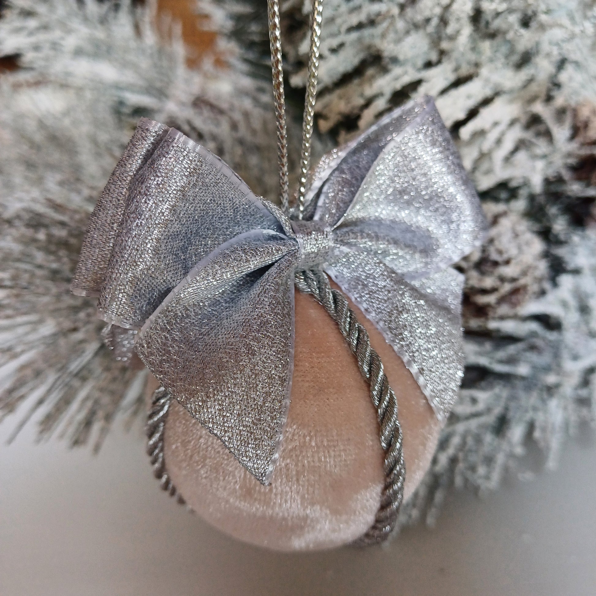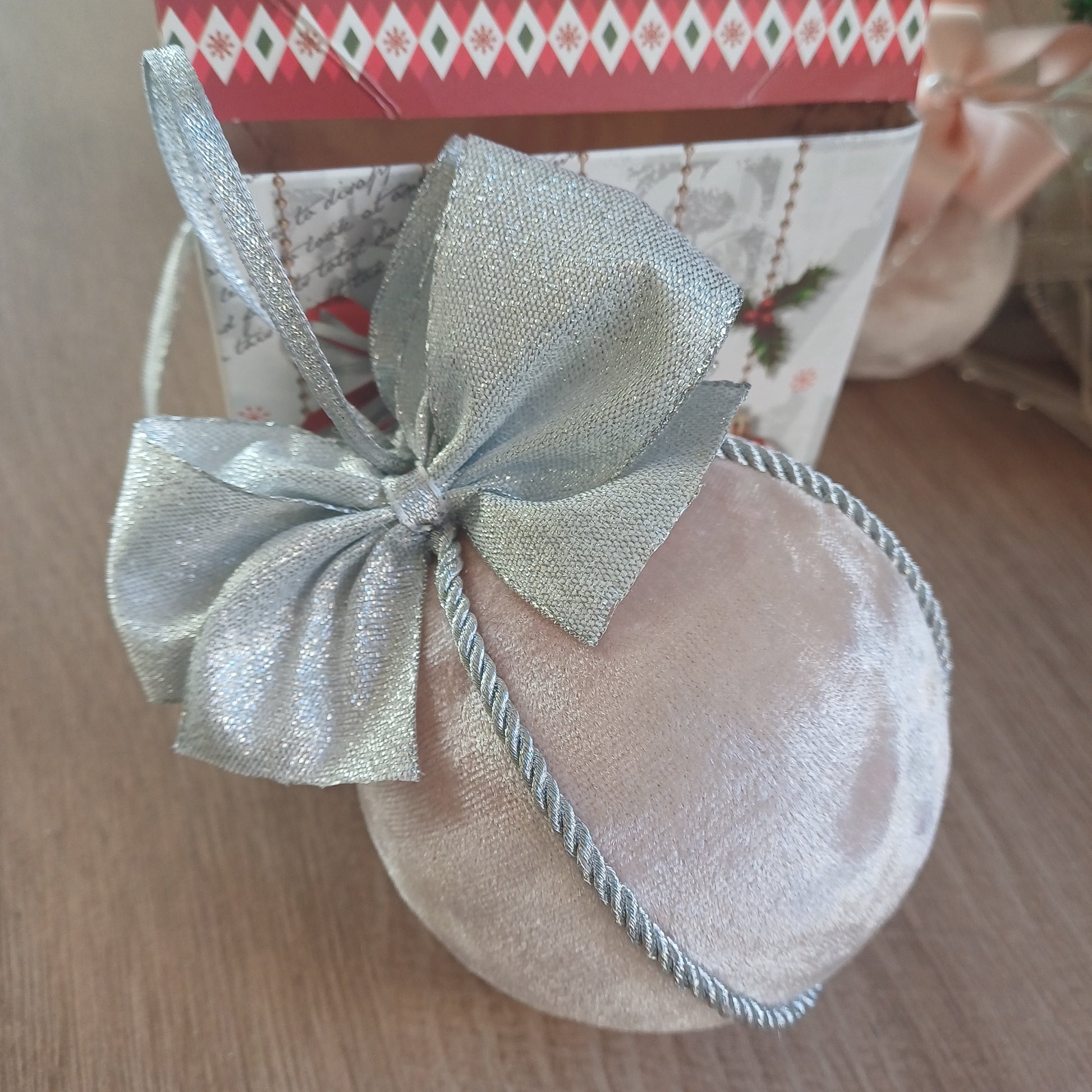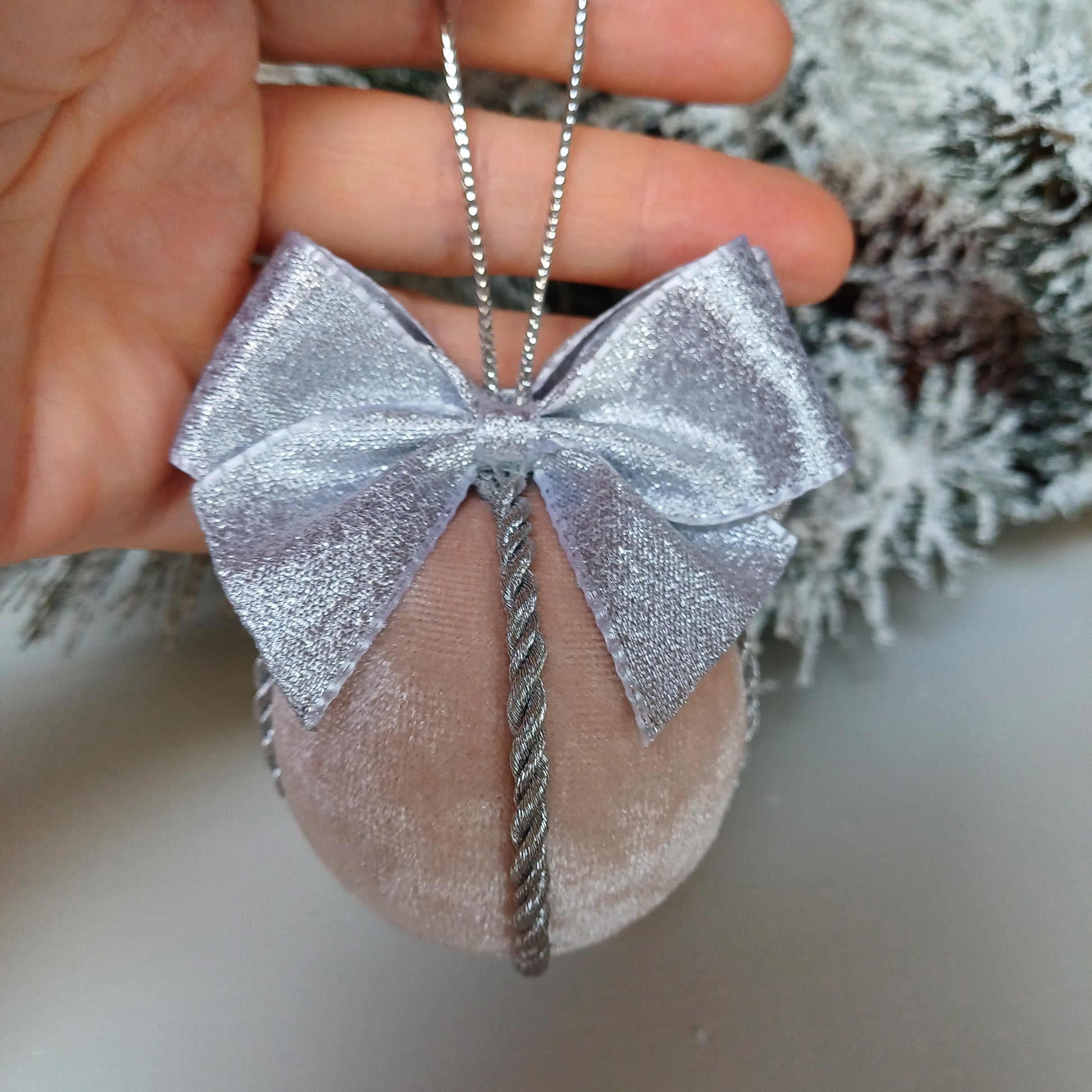 Collezione Eva include le palline decorate con fiocco argento a due lati e corda color argento.